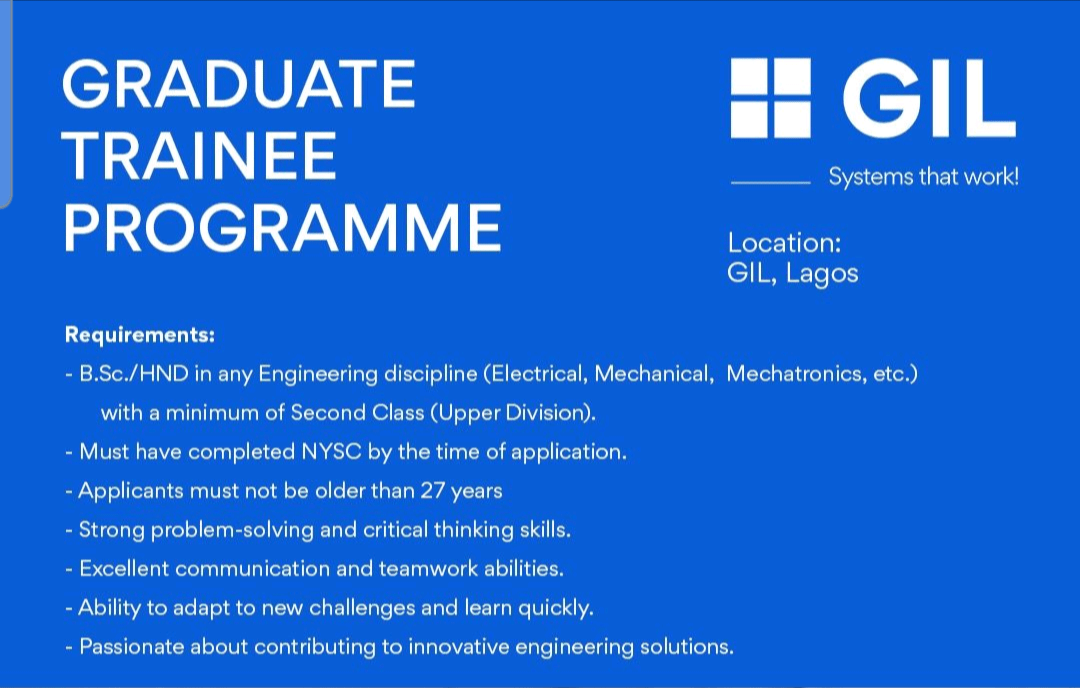 Applications are invited from suitably qualified candidates to apply for the 2026 GIL Automation Graduate Trainee Scheme.